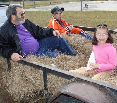 Dani Velez (right) has fun on a hayride with her grandfather, Chuck Kramer. Arthur Sinabian (background) is also pictured. Photo by Cliff Smelley.