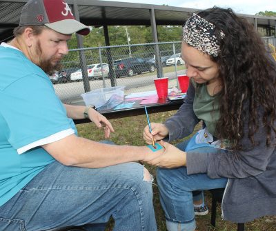 Greg Smith (left) gets the Superman symbol painted onto his hand by Alicia Parramore. Photo by Cliff Smelley.