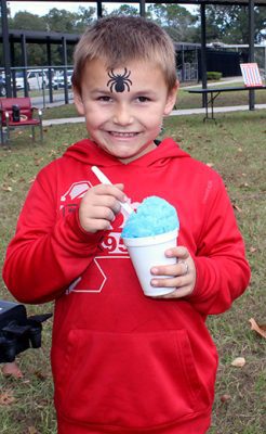 Tristan Rowe enjoys a snow cone. Oh, and don’t worry — that’s not a real spider on his forehead! Photo by Cliff Smelley.