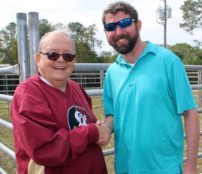 Arc of Bradford Executive Director John Williams (right) shakes hands with Mike Ruszkowski, whose wife, Sherry, won the $1,000 prize. This Arc fundraiser involves selling 100 sqaures at $50 each. Then, it’s up to nature to take its course as a cow is ultimately responsible for determining the winner. Photo by Cliff Smelley.