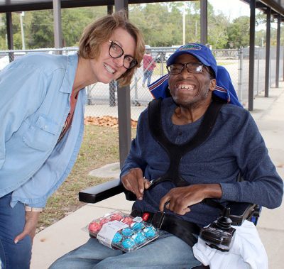 Lila Sellars (left) visits with James Searcy, who was a winner in the event’s cake walk, as evidenced by the cupcakes on his lap. Photo by Cliff Smelley.