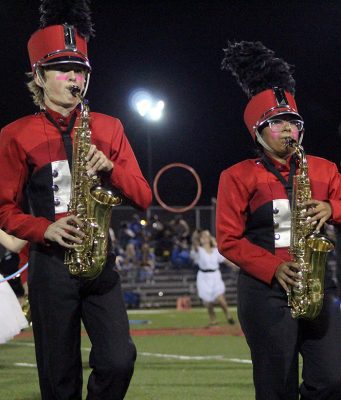 Bradford High School band members Hailey Redding (left) and Leskai Padilla (playing tenor sax and baritone sax, respectively) perform during halftime of the Oct. 27 varsity football game. The show was based on “The Greatest Showman.” Photo by Cliff Smelley.
