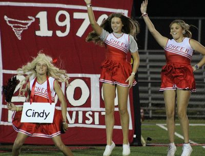 The past meets the present in the freshman skit as a pair of current cheerleaders are teamed up with former cheerleader Cindy Futch. Pictured (l-r) are Tucker Griffis, Mallory Frazier and Braylon Herndon. Photo by Cliff Smelley.
