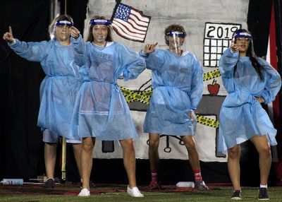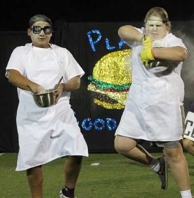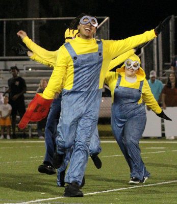 Kamryn Aldridge leads a group of minions onto the field in the senior skit. Harley Smith brings up the rear. Minions not visible are Blake Wynn and Anna Conner. Photo by Cliff Smelley.