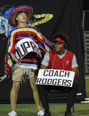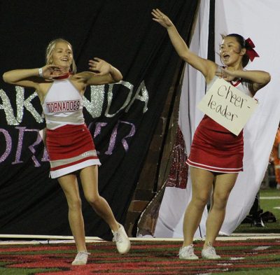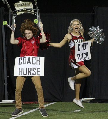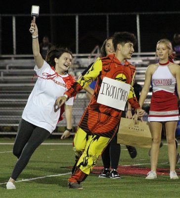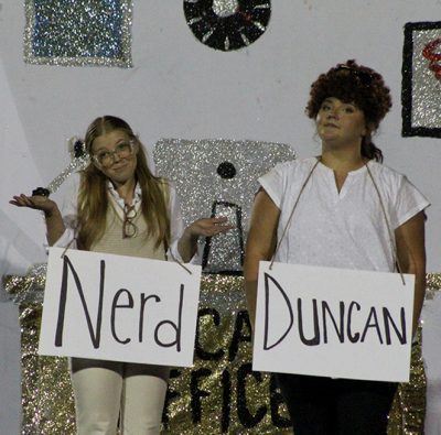 Showing off that Tornado spirit from days gone by in the junior skit are Liam Maust as Coach David Hurse and Abigail Markham as Cindy Futch. The juniors placed third in the skit competition. Photo by Cliff Smelley.