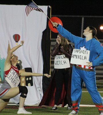 Cheerleader Kallie Yowell (left) swoons for Amy Prescott as Captain America in the sophomore skit. Kelsey Reddish (background) is also pictured. Photo by Cliff Smelley.