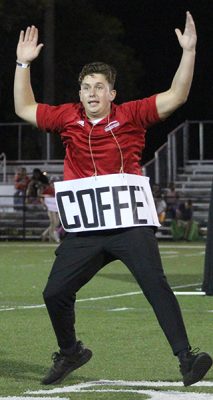 Cayden Carter is fired up as Principal Chris Coffey in the junior skit. Photo by Cliff Smelley.