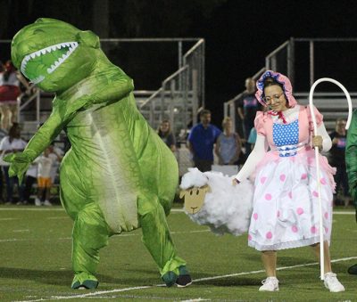Cole Ferguson (left) and Maya Moss bring “Toy Story” characters Rex and Bo Peep to life in the senior skit. Photo by Cliff Smelley.