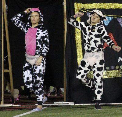 Kameron Crawford (left) and Kayden Lee play a couple of dancing cows in the senior skit.