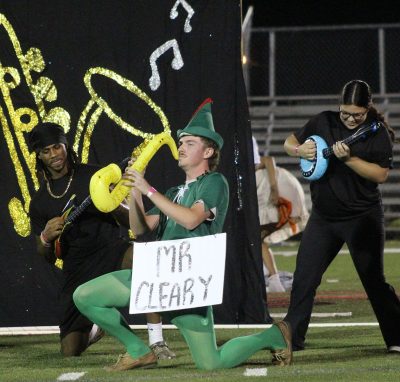 Brieon Johnson, Charlie Zink and Kelsie Cochran (l-r) play the smooth sounds of “Careless Whisper” in the senior skit, which placed second at Bradford High School’s Tornado Whirl homecoming event.