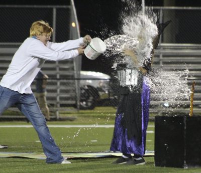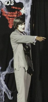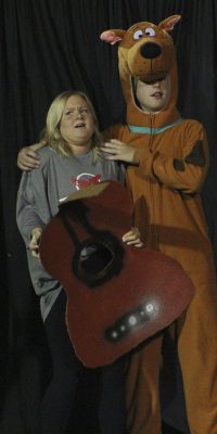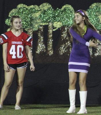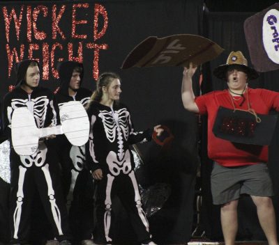 The BHS quarterback has disappeared. It’s up to the Scooby-Doo gang to find him in the sophomores’ fourth-place skit. Shaggy and Scooby (portrayed by William Maust and Trace Kite) look on as Velma (portrayed by Kailyn Gaudette) tries to find her glasses. Photo by Cliff Smelley.A football player (portrayed by Skyla Buonacore) listens to Daphne (portrayed by Madison Casey). Photo by Cliff Smelley.The quest to find the missing QB takes the Scooby-Doo gang to Will Hartley Haunted High School and the banished band room, where they are confronted by Band Director David Ramos (portrayed by Mason Hannah). Photo by Cliff Smelley.Banished band student Blakeleigh Smith, who’s pictured with Scooby-Doo (portrayed by Trace Kite), seems a little anxious. Photo by Cliff Smelley.The Scooby-Doo gang visits the Wicked Weight Room, where Coach David May (portrayed by Grayson Jennings) produces peanut butter and jelly for skeletal weightlifters Matthew Stafford, Cody Spratlin and Skyla Buonacore. Photo by Cliff Smelley.The Scooby-Doo gang stumbles onto a couple of witches, portrayed by Kendall Cook and Alyssa Jones. Photo by Cliff Smelley.Fred (portrayed by Reece Wainwright) throws water onto witch Kendall Cook. Photo by Cliff Smelley.