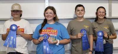 The Bradford team of (l-r) Payton McKenzie, Jackson Thames and Auston McKenzie placed first in Senior 4-H with a score of 1,104 in livestock judging at the Bradford Agricultural Fair on March 9. Photo by Cliff Smelley.The Bradford team of (l-r) Koy Hartley, Ansley Ward and Shayna Durrance placed first in Intermediate 4-H with a score of 1,041 in livestock judging at the Bradford Agricultural Fair. Durrance was the high-point individual with a score of 363 Photo by Cliff Smelley.The Bradford team of (l-r) Clyde Kelly, Hailey Griffis, Trevor Clements and Berkley Reddish placed first in Middle School FFA with a score of 958 in livestock judging at the Bradford Agricultural Fair. Photo by Cliff Smelley.The Bradford team of (l-r) Bailey Varnes, Jordan Hamilton and (not pictured) Regan Broome placed second in Senior 4-H with a score of 1,095 in livestock judging at the Bradford Agricultural Fair. Hamilton was the high-point individual with a score of 385. Photo by Cliff Smelley.The Bradford team of (l-r) Ella Hewett, Reagan Adams, Maddison Lee and (not pictured) Lakelyn Sheppard placed second in Middle School FFA with a score of 955 in livestock judging at the Bradford Agricultural Fair. Lee was the high-point individual with a score of 353. Photo by Cliff Smelley.The Bradford team of (l-r) Natalie Thames, Kaitlyn McKenzie and Kierstyn McKenzie placed third in Intermediate 4-H with a score of 793 in livestock judging at the Bradford Agricultural Fair. Photo by Cliff Smelley.