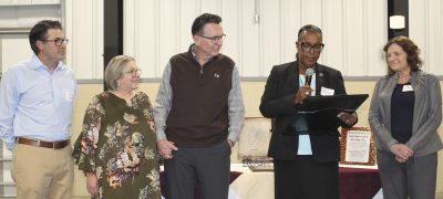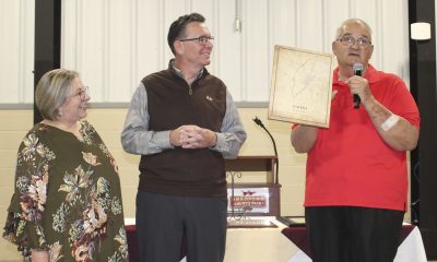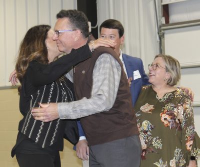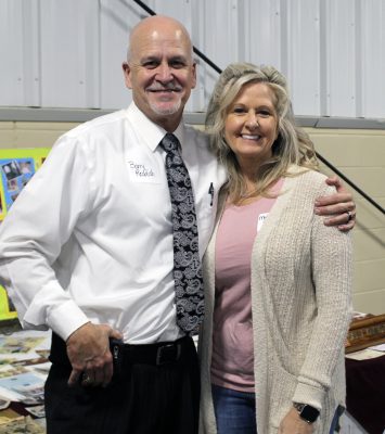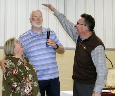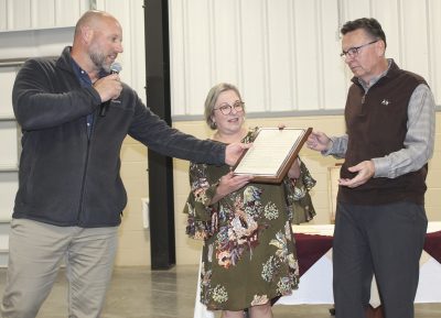 Jennifer and Terry Vaughan had a reception held in their honor on Nov. 16 at the Bradford Agricultural Fairgrounds as friends gathered to wish them well and say goodbye as the couple plans to move to Thomasville, Georgia. Above, Terry holds a Lifetime Achievement Award, which was presented by the North Florida Regional Chamber of Commerce. Photo by Cliff Smelley.
