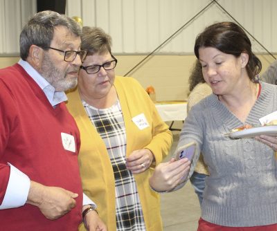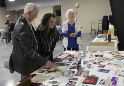 Teresa Phillips (center) and her parents, Arthur and Hilma Gaskins, look over the photo/memorabilia display. Photo by Cliff Smelley.