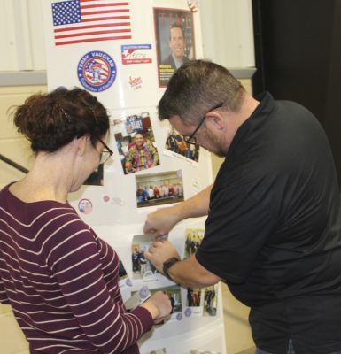 Bradford County Supervisor of Elections Amanda Seyfang (left) and Assistant Supervisor Matt Barksdale work on a display of photos. Photo by Cliff Smelley.