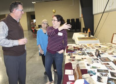 Bradford County Supervisor of Elections Amanda Seyfang (right) points out items as part of a memorabilia display to Terry Vaughan. Seyfang’s mother, Diane Gaskins (background), is also pictured. Photo by Cliff Smelley.