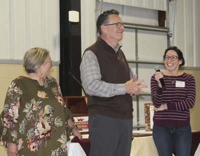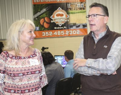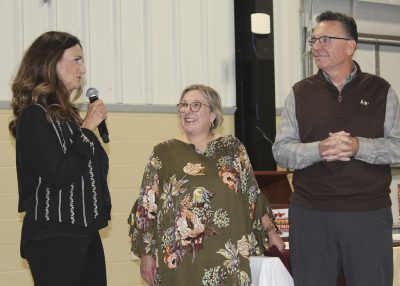 Bradford Supervisor of Elections Amanda Seyfang (far right) shares some words about her former boss, Terry Vaughan, who’s pictured with his wife, Jennifer. Photo by Cliff Smelley.