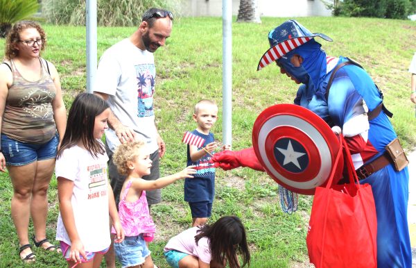 Captain America, portrayed by Col. Richard Hall of the Keystone Heights High School JROTC, hands out candy.