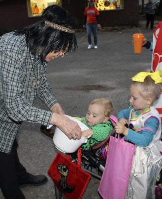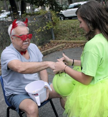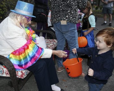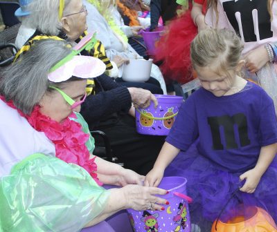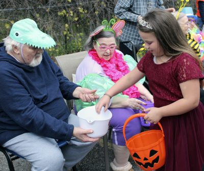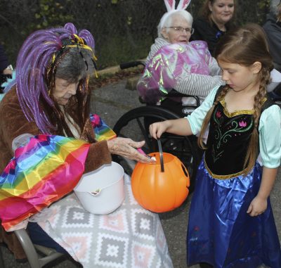 Parkside Assisted Living Facility residents, including (l-r) Esther Hall, Benton Futch and Martha Hires, got in the spirit of Halloween, dressing up and passing out candy to trick-or-treaters. Photo by Melissa Gillenwaters.Parkside residents (l-r) Ramona Crapse, Mary Stamper and Barbara Winters seem pleased with their costumes. Photo by Cliff Smelley.Patricia Friedlin (left) and Roger Westphal wait for trick-or-treaters to arrive. Photo by Cliff Smelley.Mary Sue Tomlinson (left) gives candy to 4-year-old Jesslyn Hipps. Photo by Cliff Smelley.Remi Hipps (right), who’s 12, receives candy from Ken Ryan. Photo by Cliff Smelley.Mary Stamper (left) gives a treat to 3-year-old Oliver Ferguson. Photo by Cliff Smelley.Benton Futch (far left) hands out candy to 2-year-old Alex Ridge (center) and 4-year-old Charlie Ridge. Photo by Cliff Smelley.Annie Prosser (far right), who’s 9, makes her way down the line of Parkside residents, including Mary Sue Tomlinson (center) and Bob Kozlowski. Photo by Cliff Smelley.Martha Hires (left) gives candy to 5-year-old Nadia Delotelle. Photo by Cliff Smelley.