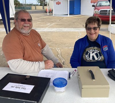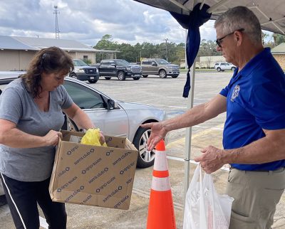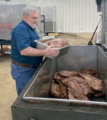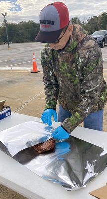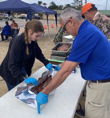 The Kiwanis Club of Starke held its annual Steve Denmark Memorial Rib Sale on Nov. 18. Jeff Oody accepts his ribs from Carol Milner, who is the wife of Kiwanis member Bob Milner. Photo by Cliff Smelley.Kiwanis member Pat Mundorff displays a slab thats ready to come out of the smoker. Photo by Cliff Smelley.Club President Nelson Green transports ribs from the smokers. Photo by Cliff Smelley.Kiwanis member Kenny Clarks is busy wrapping ribs for customers. Photo by Cliff Smelley.Kiwanis member Brad Smith (right) wraps a slab of ribs, assisted by his daughter, Bailey. Photo by Cliff Smelley.Kiwanis members Ed Rensberger (left) and Virginia Walkup are ready to greet drive-up customers. Rensberger is the chairman of the sale. Photo by Cliff Smelley.Club member Bob Milner handles the drive-up customers. Photo by Cliff Smelley.Sandra Luke (left) has a box ready for club member Brad Smith in which to carry her multiple slabs. Photo by Cliff Smelley.
