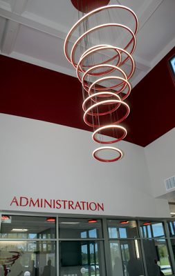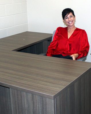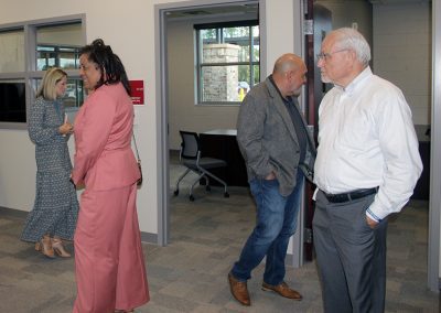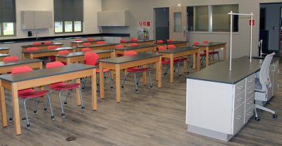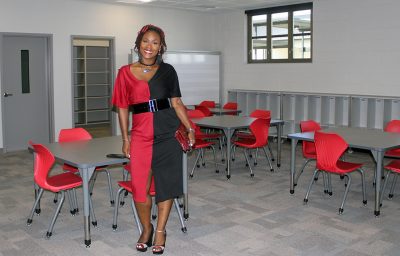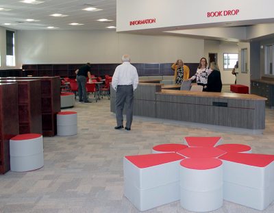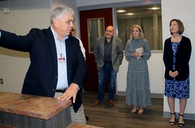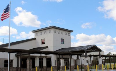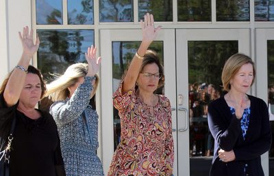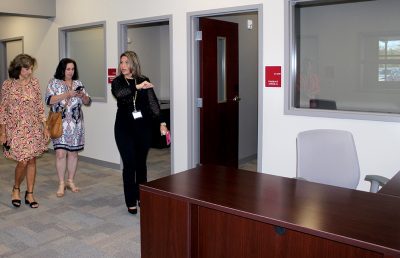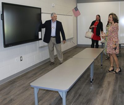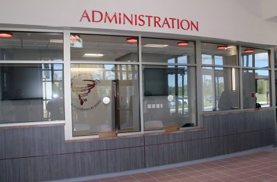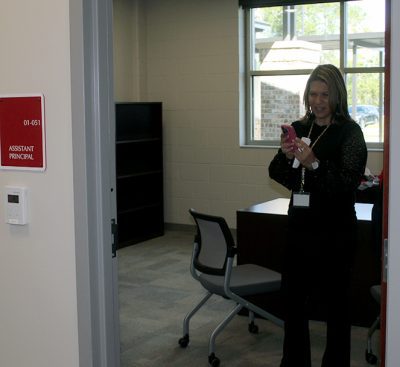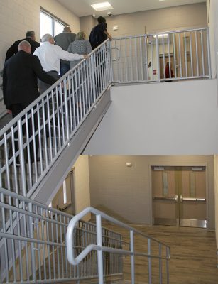 A tour of the new Bradford Elementary School by school staff and officials on Oct. 16 began with a ribbon-cutting ceremony, with Superintendent Will Hartley wielding the scissors. Pictured (l-r) are Tonya Shays, legislative aide to Sen. Jennifer Bradley; Todd Duffy, chief operations officer with Ausley Construction; School Board Member Candace Osteen; Ken Ausley, chief executive officer with Ausley Construction; Bradford Elementary Principal Cassie Melvin; Jeff Edison, operations director for Bradford Schools; Hartley; School Board Members Gayle Nicula, Lynn Melvin, Cheryl Canova and Sheila Cummings; Jim Hurry, construction project manager with Ausley Construction; and Paul Stressing, architect. Photo by Cliff Smelley.School board members (l-r) Gayle Nicula, Candace Osteen, Lynn Melvin and Cheryl Canova raise their hands toward the new school during the ceremony’s opening prayer. Photo by Cliff Smelley.The front building of the new Bradford Elementary School. Photo by Cliff Smelley.Tornadoes are prominent across campus, including hanging from the ceiling in the administration building. Photo by Cliff Smelley.The administration building as soon as you walk in. Photo by Cliff Smelley.Bradford Elementary Assistant Principal Laurén Morgan (far right) gives a tour of the guidance area, which is also where her office is located. Also pictured are School Board Member Lynn Melvin (far left) and Missy Olive, who works at the school in data entry. Photo by Cliff Smelley.Checking out Building 1 are (l-r) School Board Members Candace Osteen and Sheila Cummings, Starke City Clerk Jimmy Crosby and Starke Mayor Scott Roberts. Assistant Principal Laurén Morgan’s office is on the left. Photo by Cliff Smelley.Assistant Principal Laurén Morgan stands in what will be her new office. Photo by Cliff Smelley.School Operations Director Jeff Edison (far left) points out some features to a tour group that includes (l-r) Starke Mayor Scott Roberts (behind Edison), Starke City Clerk Jimmy Crosby and School Board Members Candace Osteen and Cheryl Canova. Photo by Cliff Smelley.A view of the new school’s media center. Photo by Cliff Smelley.School Board Member Candace Osteen enjoys a seat in the media center. Photo by Cliff Smelley.A tour group makes its way toward the elementary classroom suite. Photo by Cliff Smelley.School Board Member Lynn Melvin (right) is loving an elementary classroom’s technological features, as shown off by Operations Director Jeff Edison. Photo by Cliff Smelley.A tour group takes the stairs to the second floor of the elementary classroom suite. Photo by Cliff Smelley.Teacher Amber Hartley enjoys sitting at the desk in her soon-to-be classroom. Photo by Cliff Smelley.Bradford County Commissioner Carolyn Spooner (left) chats with teacher Margie Noegel. Photo by Cliff Smelley.Teacher Tyhesia Brady stands in her soon-to-be classroom. Photo by Cliff Smelley.Checking out one of the elementary classrooms are (l-r) Bradford County Manager Scott Kornegay, County Commissioner Carolyn Spooner, School Operations Director Jeff Edison, Starke Mayor Scott Roberts and Starke City Clerk Jimmy Crosby. Photo by Cliff Smelley.A view of the campus from the second story of the elementary classroom suite. The building at the far left contains the front office, administrative offices, guidance area, clinic and media cetner, while the building at the far right includes the cafetorium and the music and STEM areas. The building in the background is the middle-school classroom suite. Photo by Cliff Smelley.One of the science laboratories in the middle-school classroom suite. Photo by Cliff Smelley.A view of the new school’s cafeteria. Photo by Cliff Smelley.