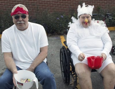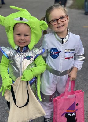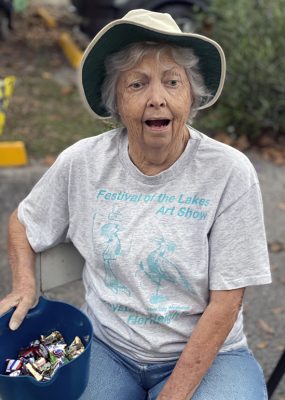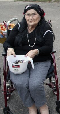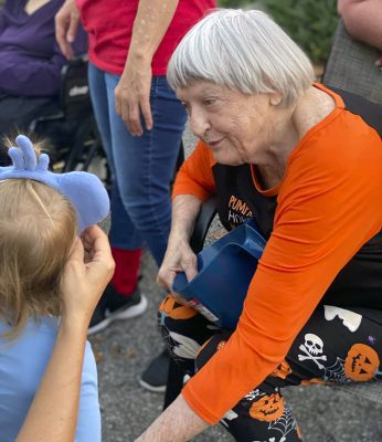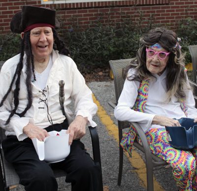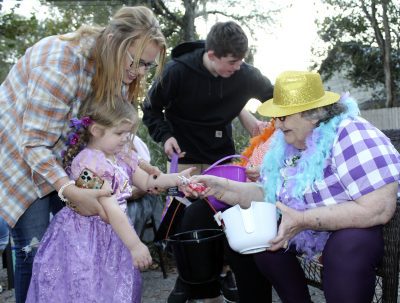 Alta Linton (left) passed out candy to trick-or-treaters, but she got a treat, too — a visit from great-grandson Brentley Schmidt. Linton and other Parkside Assisted Living residents have made an annual tradition of passing out candy on Halloween night. Photo by Cliff Smelley.PEACE, MATEY! Benton Futch (left) and Nettie Griffin dressed up as a pirate and a hippie. Photo by Cliff Smelley.Parkside resident Ann Hudson (far right) hands candy to trick-or-treater Hinlee Crews, who’s accompanied by Carlyi Crews. Photo by Cliff Smelley.Brinley Padgett (right) accepts candy from DeeDee Pickett. Photo by Cliff Smelley.Doyle Archer (right) may be dressed as a chicken, but he’s not scared to pass out candy to trick-or-treaters alongside Ken Ryan. Photo by Cliff Smelley.Parkside’s Lynell Oliver was certainly festive in her orange-and-black Halloween-themed ensemble. Photo by Melissa Reddish.Esther Shuford Hall. Photo by Cliff Smelley.Martha Hires (left) and Judy Bofinger wait to pass out candy to trick-or-treaters. Photo by Cliff Smelley.Mary Lou Gregory. Photo by Cliff Smelley.Pat Friedlin. Photo by Melissa Reddish.Carolyn Tanner. Photo by Melissa Reddish.Wake and Kingsley Best were returned to trick or treat for another year at Parkside. Photo by Melissa Reddish.