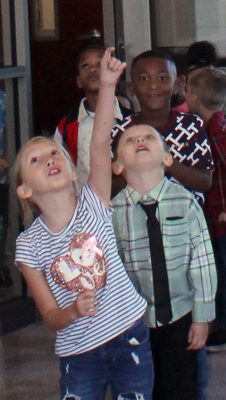 Hailynn Gonzalez and Jeffery Thompson (foreground, l-r) check out the tornado chandelier in the front office. Photo by Cliff Smelley.