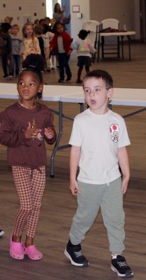 Angel Smith (left) and Liam Moylan look toward the kitchen in the cafetorium. Photo by Cliff Smelley.