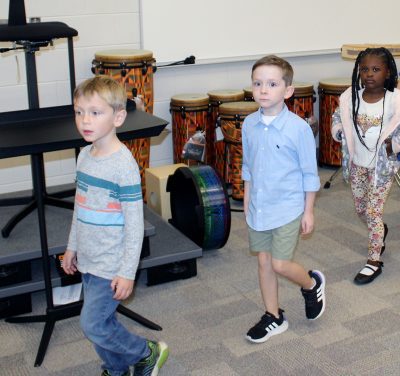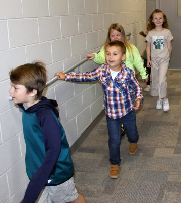 Walking down the ramp to the music room are (front-back) Weston Riddick, Tristan Rowe, Josie Weaver and Mary Croughin. Photo by Cliff Smelley.