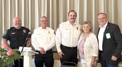 The Bradford County Auxiliary, aka the Pink Ladies, plays a special role in supporting local fire, rescue and law enforcement. Members of these departments are always honored. This year’s banquet was no exception. Pictured (l-r) are Lawtey Police Department Officer Todd Jordan, Fire Marshal Chris Cooksey, Division Chief Dylan Rodgers, Auxiliary President Linda Johns and Sheriff Gordon Smith.