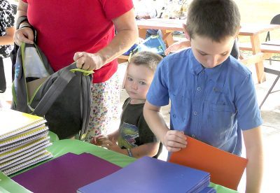 Kayde Woolard and Eli John look over and select school supplies for their backpacks.