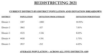 According to the elections office, the average district voting-age population of all five districts is currently 4,189 people. District 3 is furthest from the average on the high end with 336 more voting age residents, or 8% more. District one has the fewest voting-age residents and is 1,882 people below average, or nearly 45% fewer residents.