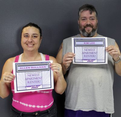 Kim Lee and Allen Sullivan each received a Newest Apartment Renter certificate, helping them celebrate the big step they’re about to take together.
