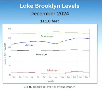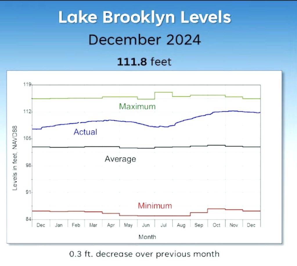 Lake Brooklyn experienced a three-tenths of a foot drop in water level during December, resulting from Clay County receiving less than one-half of its average monthly rainfall, according to the St. Johns River Water Management District.