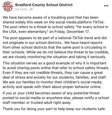 On Thursday evening, the Bradford County School District posted the following statement about school safety threats circulating on social media.