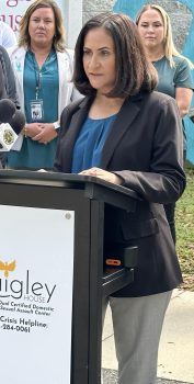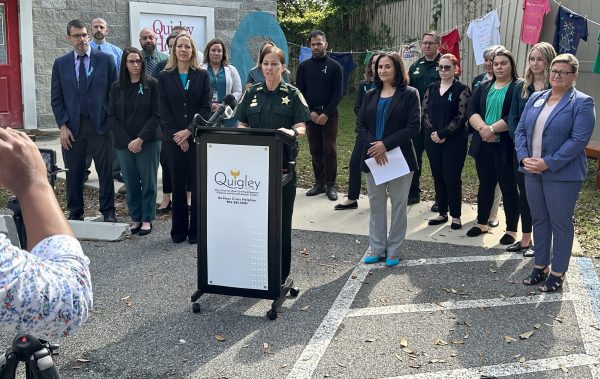 KEYSTONE HEIGHTS—Clay County Sheriff Michelle Cook joined other county officials and the staff of Quigley House to mark Sexual Violence Awareness Month during a news conference at Quigley House: the domestic violence and sexual assault center in Green Cove Springs.