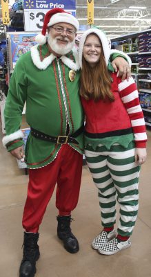 Present every year in their festive attire are Starke Police Department Maj. Barry Warren (left) and his daughter, Sarah. Warren, who tells the children he’s “Po-Po Elf,” helps to organize the event and collect donations. Photo by Cliff Smelley.