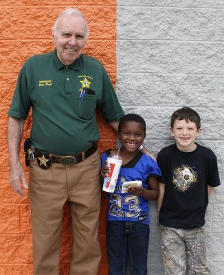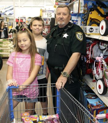 Raymond Hunt (far left) of the Bradford County Sheriff’s Office hangs out with Southside Elementary students Jayceon Bellamy (center) and John Luke Babine after their shopping sprees are over. Photo by Cliff Smelley.