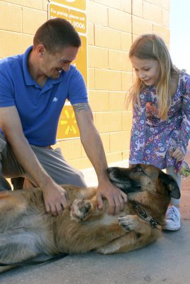 Starke Police Department’s Michael Gillick (left) gave Lawtey Elementary’s Delanie Kelly a bonus. After her $100 shopping spree, she got to visit with K-9 Officer Erin. Photo by Cliff Smelley.