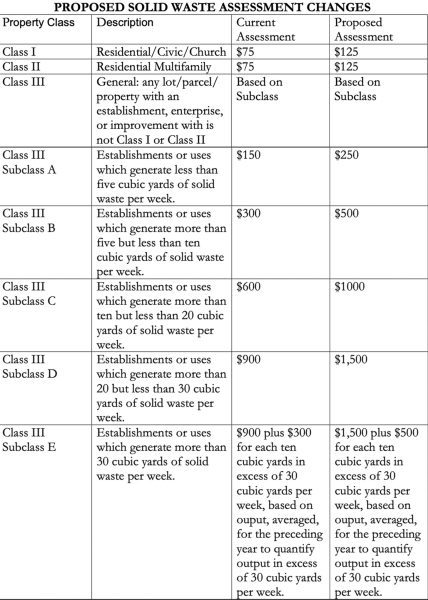 For residential waste from single and multifamily dwellings, churches, and civic organizations, the annual assessment would increase from $75 to $125. Other improved lots, including businesses, will continue to be charged based on the amount of waste generated. For less than 5 cubic yards, the $150 assessment would increase to $250, and the fees go up from there.