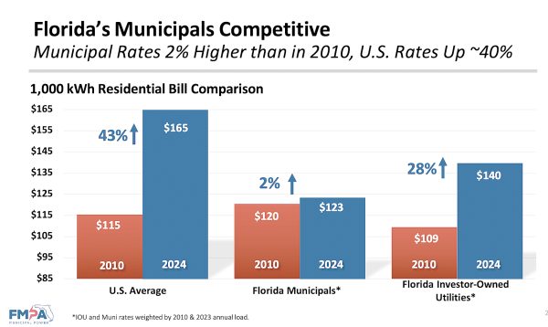 To further illustrate the pricing trend Florida municipal electric utilities were higher on average than the U.S. average and investor-owned utilities in 2010, with cities being at $120 per 1,000 kWh, the U.S. at $115 and IOUs at $109. By 2024, Florida municipal utilities bills increased just 2%, compared to 28% at the state’s IOUs and 43% across the U.S.