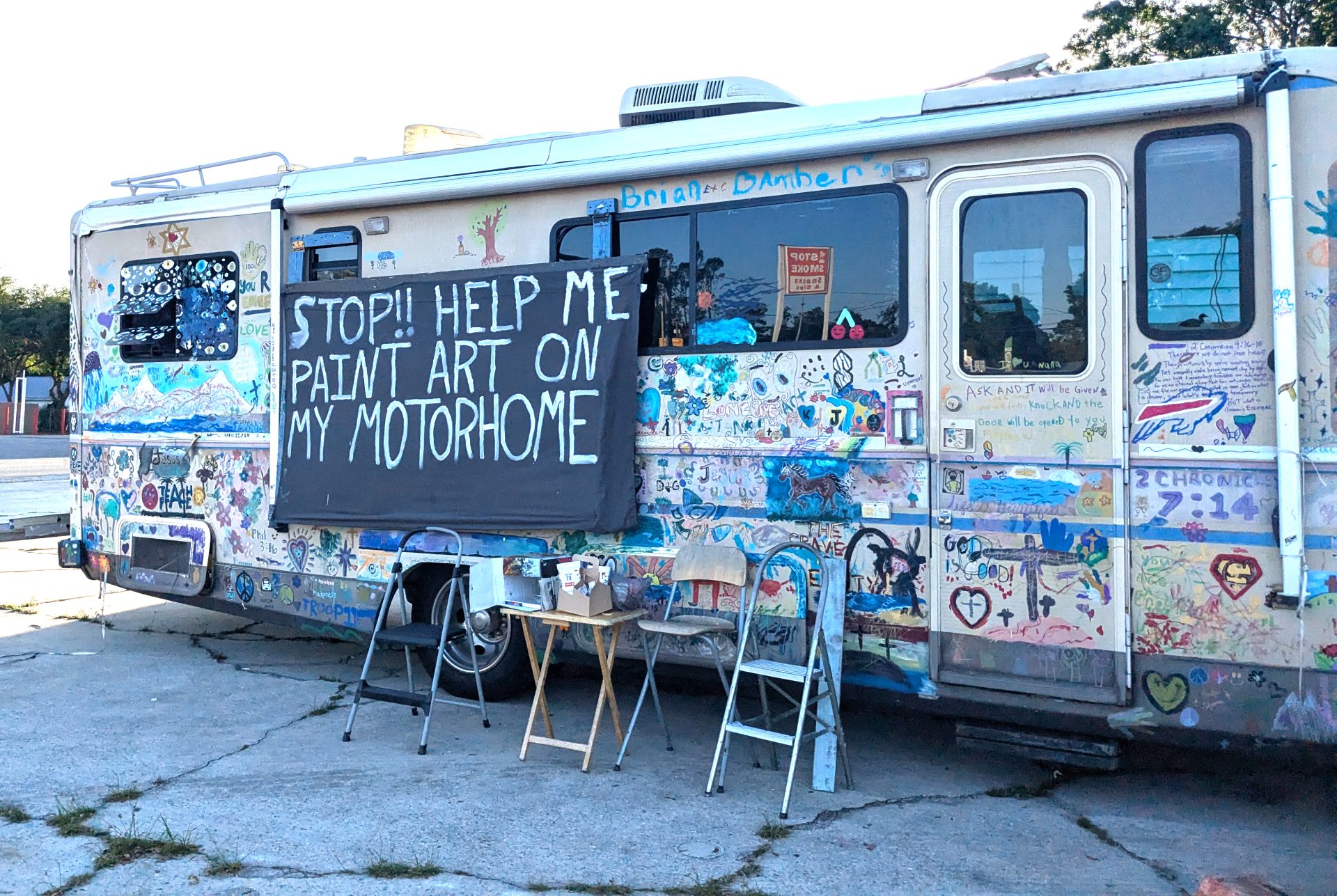 You’ll spot him by his thirty-foot 1990 Southwind RV, affectionately named Lorraine. With faded paint and character in every creak, Lorraine is more than just a vehicle — she’s a rolling canvas and sanctuary for community connection. Paul bought her for just $800, but the message he’s delivering from town to town is priceless.