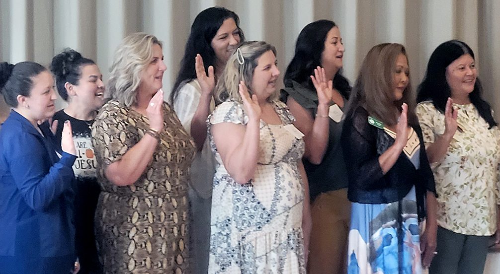 Carrie Crews, Sonia Bennett, Sabrina Roberts, Crystal Rosier, Jessica Godwin, Erica Reddish, Brenda Finn and Mary Morris (l-r) are sworn in as new members of the Woman’s Club of Starke. The club welcomed 23 new members in all at its Oct. 8 meeting