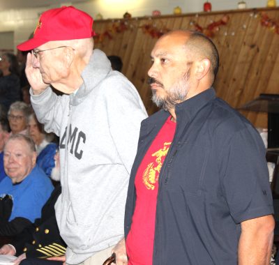 U.S. Marine retirees (left) Fred Sames and Cliff Sames stand while the band plays the Marines’ Hymn.