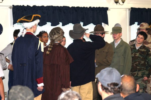 Indian Battalion Company E uniformed reenactors demonstrate the American Flag being passed between generations over the country’s 250-year history.