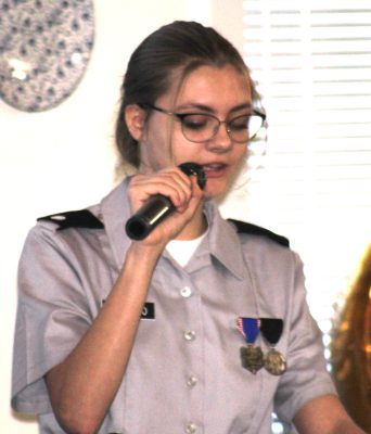 The program began with a bugle rendition of “Reveille” by Cadet Lieutenant Colonel Reagan Sames, followed by opening remarks from Tanza Conneely, Administrator of the Park of the Palms Assisted Living Facility, and welcoming comments from Richard Hall, Lieutenant Colonel, U.S. Army (Retired), Senior Army Instructor, and high school Principal Laurie Burke.