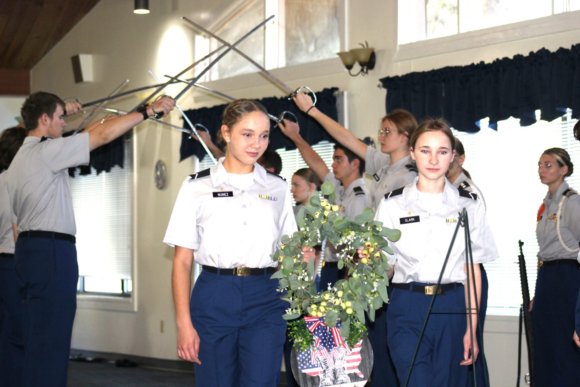 The ceremony concluded with Charlie Company, under Cadet 1st Sgt. James Doty, forming a Sabre Arch to honor deceased veterans, and Cadet PFCs Tyler Clark and Brooklyn Nunez walking through the arc and laying a wreath.