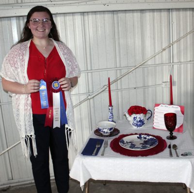 The senior division consisted of one participant, with Bradley earning a blue ribbon and the rosette with her “Red, White and Beautiful” setting, which made use of the colors red, white and blue. Her menu was made up of T-bone steak, mashed potatoes with brown gravy, green beans, garden salad, strawberry shortcake and butterfly pea flower tea.