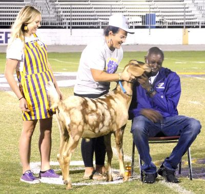 Just before the entertainment portion of the program was through, a special and quite unusual event was held – a kiss the goat demonstration. Raffle tickets had been sold, letting students name whom they would like to have the honor of kissing a goat. Students were asked to name the staff member of the community that they would like to see kiss the goat at Tiger Growl. The “winner?” Coach Jiwan James. James was a good sport about winning and came to a seat prepared for him on the field. The goat was brought to him, honey applied to his lips, and then he made several attempts at kissing it. It kissed him on the cheek as well.