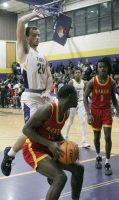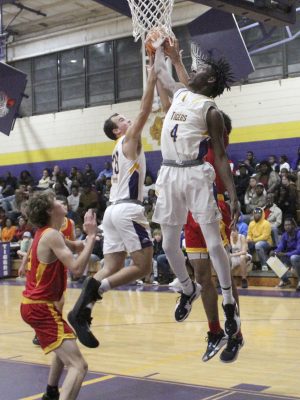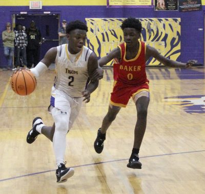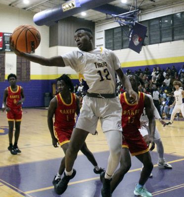 Thomas Williams (center) drives to the basket in the Tigers’ 57-46 win over Baker County on Jan. 7. Photo by Cliff Smelley.